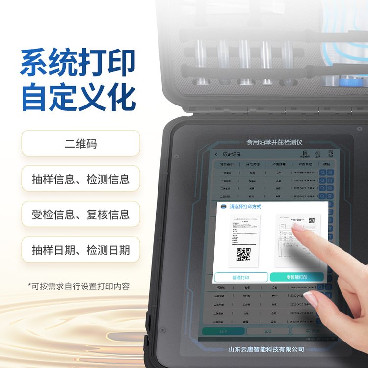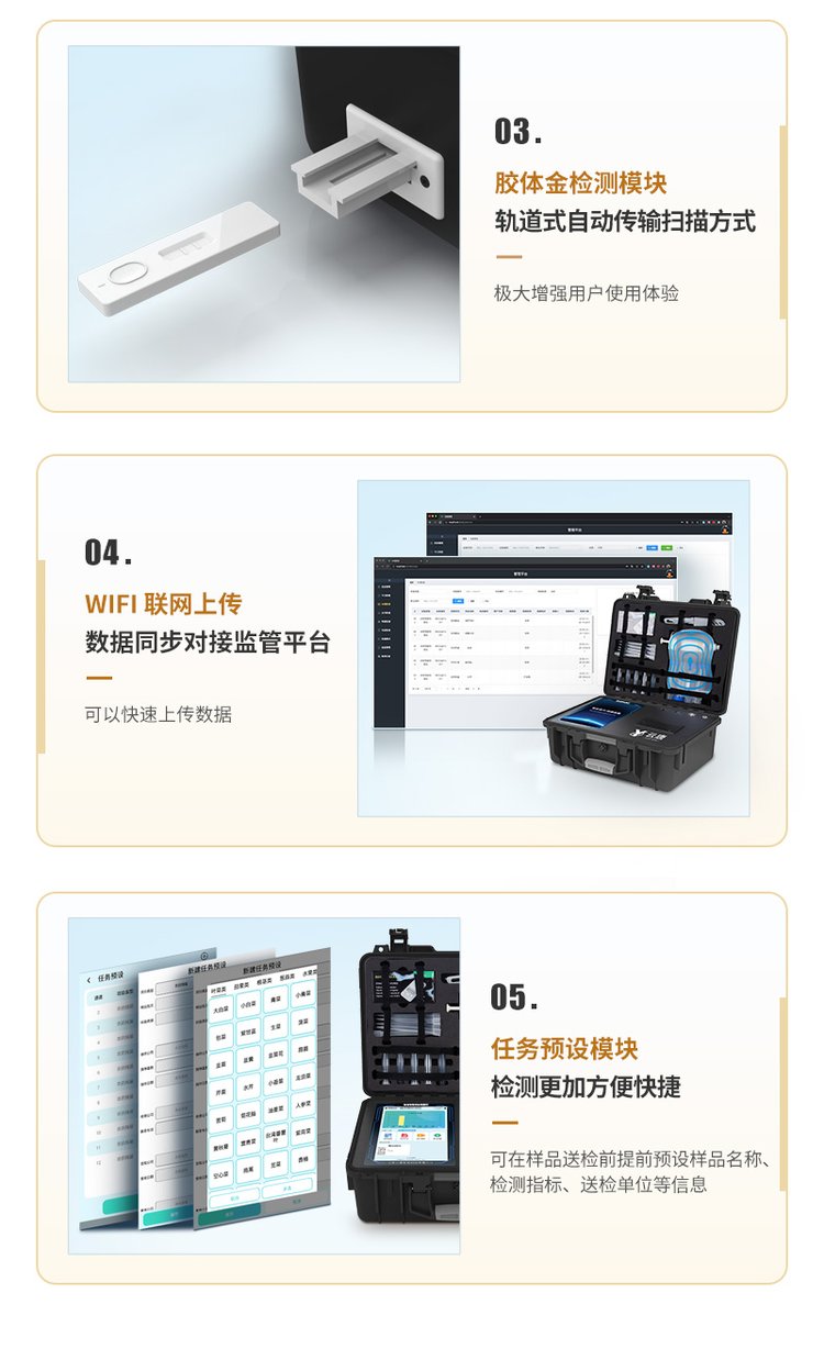 | 儀器采用10.1英寸液晶觸摸屏顯,搭配運(yùn)行安卓智能操作系統(tǒng),主控芯片采用ARM Cortex-A7,RK3288/4核處理器,主頻1.88Ghz,運(yùn)轉(zhuǎn)速度更快速,性能更強(qiáng)。 | 儀器功能包括:膠體金檢測模塊、數(shù)字化管理模塊、無線通訊模塊等,可以滿足同一軟件下實(shí)現(xiàn)所有檢測項(xiàng)目的檢測,并在同一窗口展示檢測結(jié)果。 | 一體化便攜式快檢設(shè)備,采用交直流兩用供電方式,可連接車載電源,配備6ah大容量充電鋰電池,可以滿足現(xiàn)場及流動(dòng)檢測使用的需求。儀器尺寸:43×35×20cm, 主機(jī)凈重:5.1kg | ★系統(tǒng)自帶數(shù)據(jù)集成模塊,設(shè)備首頁自動(dòng)統(tǒng)計(jì)檢測數(shù)據(jù)包含:周檢測數(shù)據(jù)、月檢測數(shù)據(jù),全部檢測總數(shù)量,均包含檢測總數(shù),合格數(shù),不合格數(shù),以及相關(guān)柱形分析圖,對各項(xiàng)檢測數(shù)據(jù)清晰掌握,無需電腦查詢,更加快捷直觀。  | 軌道式自動(dòng)傳輸掃描方式,可實(shí)時(shí)顯示金標(biāo)卡實(shí)時(shí)圖像,系統(tǒng)自動(dòng)分析并呈現(xiàn)出CT曲線圖,CT線自動(dòng)識(shí)別,無需手動(dòng)調(diào)整,完成檢測后自動(dòng)退出檢測卡。 | 結(jié)果判定線可修改,對照值標(biāo)定值可保存,斷電不丟失數(shù)據(jù)。 | 兼容市場上其他膠體金卡,使用耗材不受限制,極大增強(qiáng)用戶使用體驗(yàn)。  | 儀器檢測系統(tǒng)擁有龐大數(shù)據(jù)庫,并且構(gòu)建了完善的檢索、修訂功能。 | 食品庫涵蓋多種樣品名稱,可按需添加或刪除、編輯樣品名稱; | 產(chǎn)品數(shù)據(jù)庫以及歷史檢測記錄支持一鍵檢索功能。 | 系統(tǒng)打印自定義化,打印格式多樣化,產(chǎn)品合格證(國家標(biāo)準(zhǔn)要求),二維碼,抽樣信息、檢測信息,受檢信息、復(fù)核信息、抽樣日期、檢測日期等信息結(jié)果,可按需求自行設(shè)置打印內(nèi)容。 | 內(nèi)置限量規(guī)判程序:具有限量查詢、添加物質(zhì)合規(guī)判定系統(tǒng)。檢測出結(jié)果后,系統(tǒng)自動(dòng)調(diào)用系統(tǒng)數(shù)據(jù)庫中相關(guān)國標(biāo)進(jìn)行比對判定,客觀顯示判定結(jié)果是否合格,檢測對象是否允許添加該物質(zhì),若允許添加則能準(zhǔn)確獲得食品中添加該物質(zhì)的限量及添加依據(jù)的國家標(biāo)準(zhǔn)。 | 儀器具有 wifi 聯(lián)網(wǎng)上傳、RJ45網(wǎng)線連接功能,可以快速上傳數(shù)據(jù)。同步對接監(jiān)管平臺(tái),數(shù)據(jù)可局域網(wǎng)和互聯(lián)網(wǎng)數(shù)據(jù)上傳,檢測結(jié)果直接傳至食品安全監(jiān)管平臺(tái)。進(jìn)行區(qū)域食品安全監(jiān)管及大數(shù)據(jù)分析處理與數(shù)據(jù)統(tǒng)計(jì),檢測區(qū)域食品安全長短期動(dòng)態(tài),達(dá)到食品安全問題預(yù)估、預(yù)警。 | 設(shè)備支持U盤存儲(chǔ),標(biāo)準(zhǔn)USB接口,免驅(qū)動(dòng)安裝。檢測結(jié)果存儲(chǔ)容量20萬條以上,可生成Excel表格,進(jìn)行一鍵拷貝,并具有登錄保護(hù)功能,可設(shè)置用戶名及密碼,規(guī)范不同人員操作權(quán)限,防止非工作人員操作,并且可以進(jìn)行重新校準(zhǔn)、鎖定、恢復(fù)出廠設(shè)置功能。儀器固件可升級,后期檢測項(xiàng)目可擴(kuò)充。 | 儀器加入遠(yuǎn)程升級功能,可定向分客戶分儀器更新,開機(jī)后自動(dòng)更新,客戶無需任何操作,即可升級全新項(xiàng)目。做到了無需退換機(jī)器即可實(shí)現(xiàn)實(shí)時(shí)遠(yuǎn)程升級檢測儀器。 | 可連接外部打印機(jī),打印A4紙規(guī)格的檢測報(bào)告(可選配) |